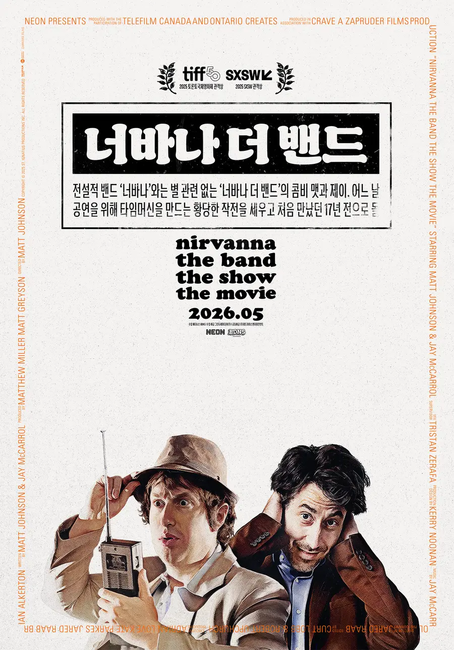 A time-machine chaos comedy for the comedic duo 〈Nirvana the Band...〉, which won the Audience Award in the Midnight Madness section at the 2025 Toronto International Film Festival and the Audience Award in the Midnight section at the SXSW Film Festival, depicts what happens as the duo Matt and Jay of 'Nirvana the Band' set their plan in motion to build a time machine on performance day. Scheduled to be revealed at the Jeonju International Film Festival on April 29, 〈Nirvana the Band...〉 has since confirmed an official release in theaters on May 20.