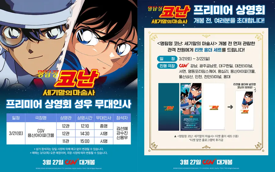 『名探偵コナン: 世紀末の魔術師』プレミア上映会は、3月21日(土)、3月22日(日)にCGV龍山アイパークモールから永登浦タイムスクエア、王十里、江南、弘大、光州金南路、大邱韓日、テジョンターミナル、西面、蔚山三山、仁川、天安ターミナルまで全国の主要CGV店舗で行われる。本イベントは上映後、映画を観た観客に『名探偵コナン: 時限装置の摩天楼』、『名探偵コナン: 14番目の標的』に続く旧作初公開シリーズのシグネチャーであり、第三のコレクショングッズであるスペシャルチケットとチケットホルダーをプレゼントする。今回の特典では、主人公のコナンだけが見えるように設計されたチケットホルダーからチケットを取り出すと、メインポスタービジュアルのチケットが現れる。これは『メモリーズエッグ』の隠された真実を明らかにするコナンたちのように、パッケージ内の隠されたビジュアルを発見する楽しみポイントを加えた。また、ホログラム加工で所持欲を高める。
