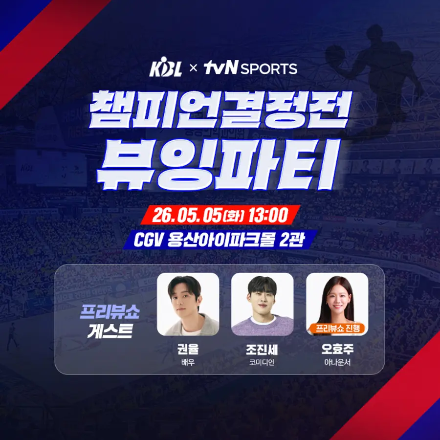 이번 행사는 오는 5월 5일 오후 1시 CGV용산아이파크몰 2관에서 개최된다. 경기 시작 전 주요 관전 포인트를 짚어보는 프리뷰쇼를 진행한 뒤 이어서 챔피언결정전 1차전 경기를 대형 스크린으로 생중계하는 방식이다. 현장에는 배우 권율, 코미디언 조진세, 아나운서 오효주가 참석해 관객들과 함께 경기를 관람할 예정이다.